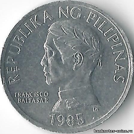 10 сентимо, представленные в этом материале, чеканились без существенных изменений с 1983 по 1994 г. Эта монета стала частью серии, посвященной местной флоре и фауне, выпущенной в 1983 г. Сюжет реверса 10 сентимо косвенно напоминает и о Всемирной конференции по рыболовству, проходившей в том же году. На аверсе монеты – увенчанный лавровым венком профиль человека в униформе. Это Франциско Бальтазар (1788 – 1862), филиппинский писатель. Он прославился благодаря своей поэме « Флоранте и Лаура », эпическому сочинению, действие которого происходит в Древней Греции. На монете имя поэта отчеканено в две строки, слева от портрета.