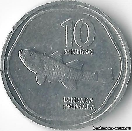 Вверху вдоль полированного бортика читается название страны, Республика Филиппины. В нижней части отчеканена дата эмиссии. В центре реверса, внутри шестиугольной рамки с закругленными углами, помещено изображение карликовой пандаки, самой маленькой рыбки на земле. Pandak в переводе с филиппинского означает « маленький », а pygmaea – то же самое на латыни. Эта бесцветная, почти прозрачная рыбка длиной около 15 мм и весом 5 мг водится в морях, омывающих Филиппины, в частности, вблизи острова Лусон. Над изображением рыбки в две строки нанесен номинал монеты, 10 сентимо. Внизу обозначено название вида рыбы. Карликовая пандака в результате загрязнения филиппинских вод находится на грани исчезновения.