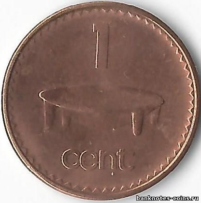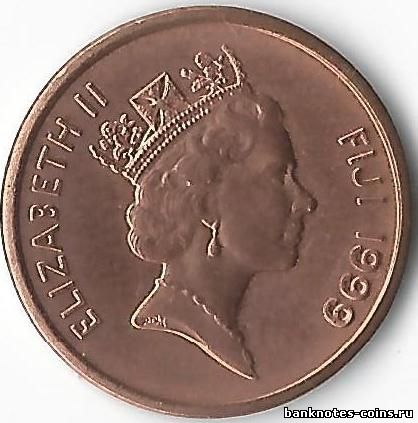 Монета 1 цент островов Фиджи, составляющая сотую часть доллара, представлена на этой странице, выпускалась Королевским канадстким монетным двором в Оттаве в 1990, 1992, 1994, 1995, 1997, 1999, а так же между 2001 и 2005 г. Цент и 2 цента Республики Фиджи были демонетизированы местным правительством в 2009 г. как утратившие покупательную способность. В центре аверса расположен профильный портрет королевы Елизаветы II, главы Британского Содружества нации, в состав которого входили Фиджи в качестве автономной республики. Портрет написан художником Рафаэлем Маклауфом, это парадное изображение можно встретить на монетах Соединенного Королевства Великобритании и Ирландии и Британского Содружества нации.