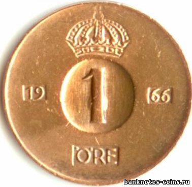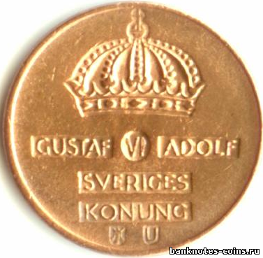 Монета 1 эре, одна сотая крона, чеканилась без перерывов в 1952-1971 гг. от имени Густава VI Адольфа, короля Швеции (1950-1973), и вышла из законного обращения 30 июня 1972 г.