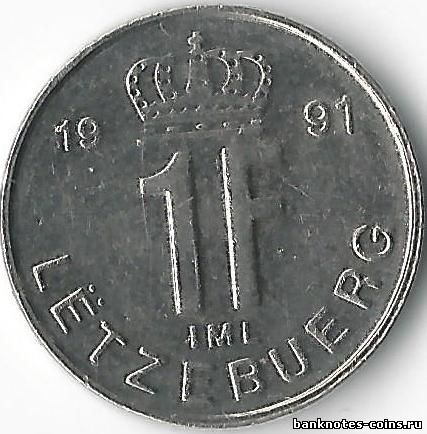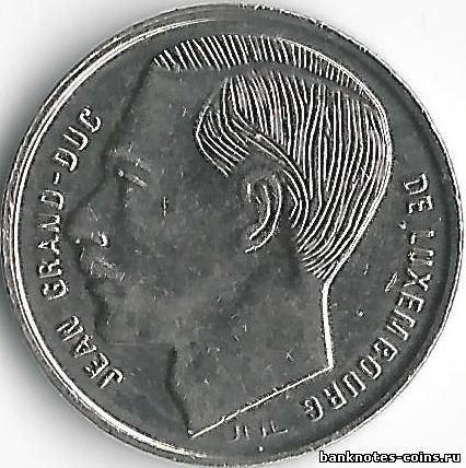 Великое герцогство Люксембург приняло франк в качестве национальной валюты в 1848 г. Монета 1 франк, представленная на этой странице, чеканилась с 1988 г. по 1995 г. на Королевском монетном дворе Бельгии в Брюсселе, своего монетного двора Люксембург не имеет. Чеканы 1988 – 1991 гг. поступали в обращение, а монеты следующего до конца 1995 г. периода – 10 000 монет в год – были объединены в серии и предназначались только для коллекционеров. Люксембургский франк вышел из обращения 1 января 2002 г., окончательно уступив свое место евро 28 февраля того же года. На аверсе почти вся поверхность занята левым профилем Великого герцога Жана.