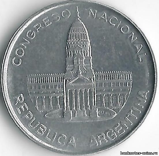 На аверсе монеты изображена центральная часть Дворца Национального конгресса в Буэнос – Айресе, места заседаний Палаты депутатов и аргентинского Сената. Здание, увенчанное грандиозным куполом и украшенное колоннами, лестницами и архитектурными деталями, было возведено в начале XX в. в эпоху расцвета Аргентины, ставшей центром притяжения для множества эмигрантов из Европы. Внизу, вдоль буртика, можно прочесть название страны – эмитента, Республика Аргентина. Вверху – разделенная надвое шпилем Дворца надпись : « Национальный конгресс ». На реверсе монеты находится обозначение номинальной стоимости : большая цифра «1» в центре, а под ней – слово «песо», отчеканенное более мелким шрифтом, и дата чеканки : 1984 г. Гурт монеты гладкий, а контур с обеих сторон слегка рельефный. Такие монеты чеканились на монетном дворе Буэнос – Айреса.