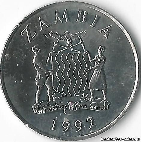 Пять лет спустя после отделения от федерации, объединявшей южную часть Родезии и Ньясаленд, 16 января 1969 г., Замбия приняла десятичную денежную систему, основанную на денежной единице квача, состоящей из 100 нгвей. На я зыке бемба « квача »означает « заря », а « нгве » - «блестящий ». Оба названия символизируют новую зарю свободы, восходящую над Замбией. Монеты 25 нгвей была отчеканена в 1992 г. и имеет гладкий гурт. В верхней части аверса расположено название страны – эмитента, внизу – год чеканки. В центре изображен национальный герб, элементы которого : парящий орел, символ свободы ; скрещенные кирка и мотыга, символы земледелия и геологии ; щит с волнистыми вертикальными линиями – стилизованное изображение водопада Виктория ; щитодержатели – мужчина в европейской одежде и женщина в национальном наряде ; початок кукурузы и шахта – знаки сельского хозяйства и горнодобывающей промышленности ; зебра – символ богатой фауны Замбии ; лента, на которой написан девиз : « Одна Замбия, одна нация ».