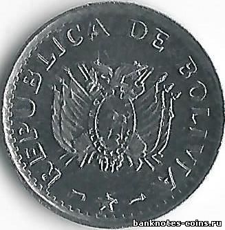 Край щита украшен десятью звездочками, которые символизируют девять провинций страны, а также десятую, нижняя часть территории которой входит в состав Чили, а верхняя – в состав Боливии. Внутри видна гора Черро Рико и сияющее солнце, а у подножия горы – альпака ( боливийцы считают ее своим национальным животным), вставшая под тень дерева, и сноп зерна, символизирующий сельскохозяйственные ресурсы страны. Пушки и мушкеты напоминают об освободительной борьбе, фригийский колпак и топор – о независимости, обретенной благодаря силе оружия, ветви лавра – о достигнутом мире, а сидящий на щите кондор, который смотрит вдаль, - о том, что страна будет всегда на страже своих интересов. Нa аверсе две окружности ( внутренняя образована короткими, расположенными под углом линиями, а внешняя – маленькими точками), внутри которых написан девиз « La union es la fuerza » ( « Единство – сила » ) и дата эмиссии. В центре монеты – обозначение ее номинала цифрами и прописью над двумя прекращенными ветвями лавра.
