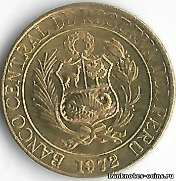 На монетах выпуска 1969-1972 гг. герб был крупнее, чем в 1974-1975 гг.; а в 1973 г. появлялись монеты с гербом то большего, то меньшего размера. Вдоль контура находится рельефное кольцо, с его внешней стороны можно прочитать название учреждения-эмитента: Центральный резервный банк Перу (исп. Banco Central de Reserva del Peru), а в нижней части – дату эмиссии. На экземплярах 1966 г. внизу слева, рядом с гербом, указана фамилия автора монеты: это перуанский гравер Армандо Пареха Ландео (1901-1984).