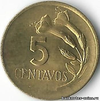 Монета 5 сентаво, или пять сотых соля, представленная на этой странице, чеканилась из латуни на монетном дворе Лимы – хотя его знак никогда не ставился – с 1966 по 1975-й, каждый год, и вышла из обращения в 1985-м. Ребро всегда было гладким. В 1966 г. также появилось несколько экземпляров с зеркальным фоном, а через год – несколько монет из латуни, покрытые серебром и изготовленных из серебра.