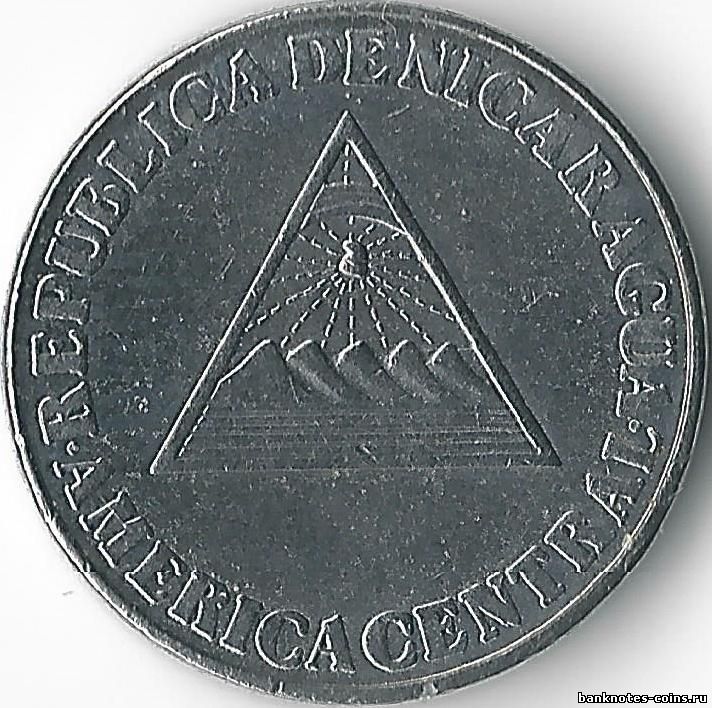 Вода, окружающая вершины, обозначает два океана, омывающие побережье Центральной Америки : на западе – Тихий океан, на востоке – Атлантический. Конусы вулканов венчает фригийский колпак, напоминающий о ценности свободы. От колпака исходят 12 лучей. Вверху раскинулась радуга, символ мира. На реверсе в центре монеты изображена карта страны, над которой парит голубь с оливковой ветвью в клюве – вестник мира. Внизу отпечатана дата выпуска, 1994 г. Вдоль контура идут надписи, разделенные точками : название учреждения – эмитента, Центральный банк Никарагуа, и номинальная стоимость цифрами и прописью, 5 сентаво кордобы.
